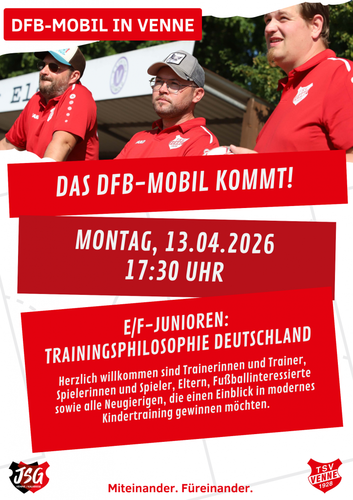 Am kommenden Montag, den 13.04.2026 von 17:30 bis 19:00 Uhr macht das DFB-Mobil Halt auf unserem Sportgelände und stellt das Modul E/F-Junioren: Trainingsphilosophie Deutschland vor!